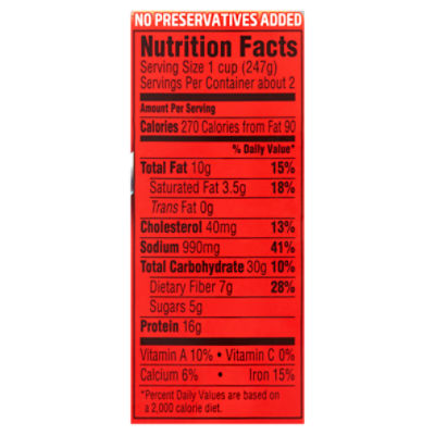 Hormel Foods Corporation, HORMEL Chili No Beans - Label Advisor Calories 260 Calories from Fat 130 % Daily Value* Total Fat 14 22% Saturated Fat 5 25% Cholesterol 35 12% Sodium 990mg 41% Total Carbohydrate 19 6% Dietary Fiber 3 12% Sugars 4 Protein 15 29% Vitamin A 10% Vitamin C 0% Calcium 4% Iron 8% *Percent Daily Values are based on a 2,000 calorie diet.