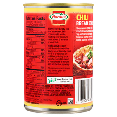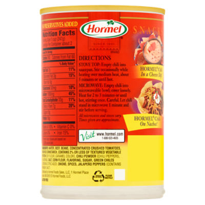 Hormel | Products | HORMEL® Chili Ingredients: Beef, Water, Tomatoes (Water, Tomato Paste), Tomatoes in Tomato Juice (Contains Calcium Chloride, Citric Acid), Bell Peppers, Red Bell Peppers, Modified ...