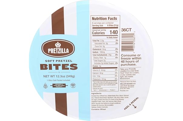 Amazon.com: super pretzel J and J Snack Super King Size Soft Pretzel -- 50 per case. 5.0 out of 5 stars 1. $139.86 $ 139. 86 ... More Buying Choices $139.20 (3 new offers) Superpretzel Super Jumbo Soft Pretzel, 10 Ounce -- 25 pretzels per case. 10 Ounce (Pack of 25) 3.2 out of 5 stars 3. ... 100 Calorie Individual Packs, 24 Count. 0.9 Ounce (Pack of 24) 4.8 out of 5 ... Superpretzel Soft Pretzels Baked King Size 24 Ct Allergy and Ingredient ... Superpretzel Soft Pretzels Baked King Size 24 Ct UPC Code 073321034726 superpretzel soft pretzels. Allergen Inside Helping You Shop & Eat Safer. Home; Membership Plans; Allergy Tools . ... Calories 180 Calories from Fat 10 % Daily Value* Total Fat 1g. 1.53%. Saturated Fat 0g. 0%. Trans Fat 0g. Cholesterol 0g. 0%. Sodium 0.15g. 6.25%. SUPERPRETZEL Soft Pretzels Directions. Preheat over to 350 degrees Fahrenheit ; Place pretzel bites on sheet pan and place in oven for 3 minutes; Remove pretzel bites from oven and allow to cool slightly