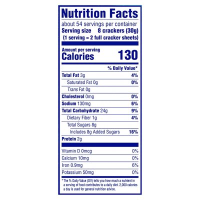 Honey Maid Honey Graham Crackers, 12 - 14.4 oz Boxes Shop Honey Maid Honey Graham Crackers, 12 ... which break down to 8 pieces. So two crackers are, 130 calories, 3 grams of fat, 24 carbohydrates, 8 grams of sugar, and ...