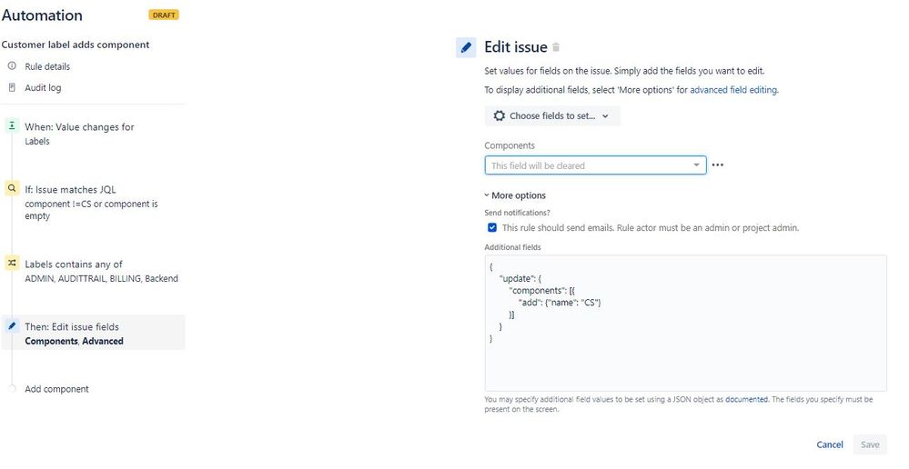 How to Use Components in Jira - Modus Create In Jira, navigate to the project you want to update. From the sidebar, select Project Settings, then select Components. Click the Create component button and supply the following information: Name (required) Description Component Lead Default Assignee Click Save Done! 🎉 You've created your first component. Keep in mind… Subcomponents for Jira | Atlassian Marketplace Enable users to select components from the hierarchy in issues including Customer Portal. Find issues and create reports based on subcomponents hierarchy. Release components independently with Versions Organize and manage release roadmap on a component level. Different teams can develop and release different components in one project. How to auto assign issues with Jira Software automation - Atlassian Click New Action. On the New Action screen search for and click the Assign issue option. From the Assign issue prompt, select a user who will be assigned issues. Click the Save button. Next you can add an if/else condition to the If:matches condition.