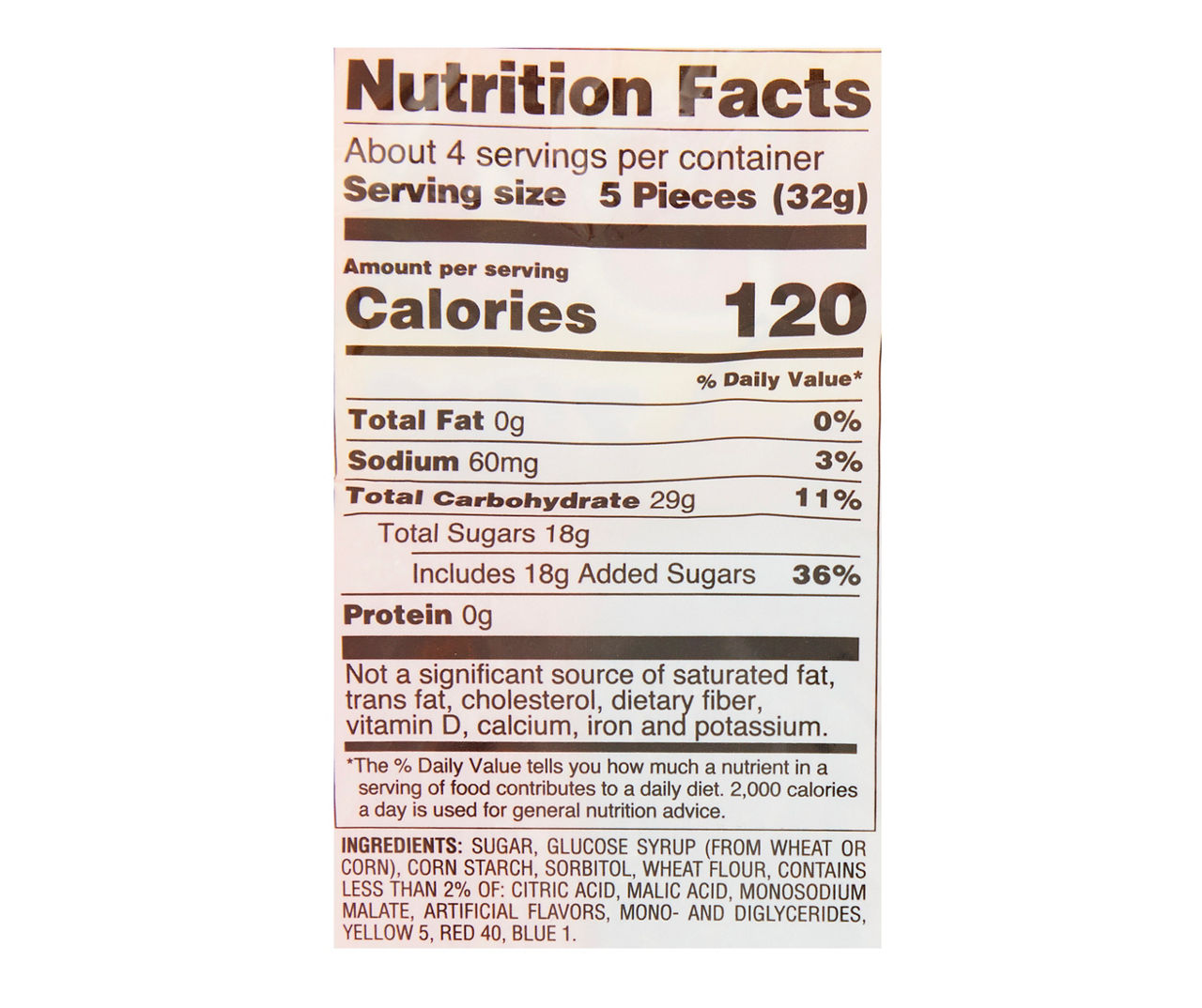 Calories in Haribo Sour Gold Bears and Nutrition Facts - FatSecret Nutrition Facts Serving Size 16 pieces (41 g) Amount Per Serving Calories 160 % Daily Values* Total Fat 0.00g 0% Saturated Fat - Trans Fat - Cholesterol 0mg 0% Sodium 15mg 1% Total Carbohydrate 36.00g 13% Dietary Fiber 0.0g 0% Sugars 20.00g Protein 3.00g Vitamin D - Calcium - Iron - Potassium -