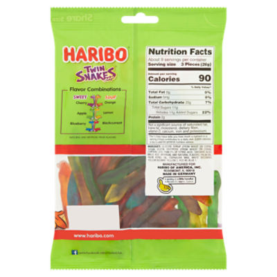Haribo sour gummy bears calories. Haribo Goldbears Gummi Candy, Sour, 9 oz. Re-Sealable Bag, (Pack of 8) Haribo Gummi Candy Sour Gold-Bears 25.6 oz Resealable Bag. ... Calories 110 Fat 0g Total Carbohydrates 24g Sugars 16g Protein 2g Sodium 15mg Read more. Read more. Product description Size:9 Ounce (Pack of 8) | Pattern Name:Candy. Say hello to America's #1 Selling Gummi Bear with a sour twist! ... HARIBO Sour Smurfs Say hello to HARIBO® Sour Smurfs. Your favorite HARIBO Smurfs have gone sour! ... The world's first gummi-entertainment network. Stream now on Instagram Nutritional values Ingredients Serving Size: 7 pieces (32g) Calories: 110: Fat: 0g: Total Carbohydrates: 26g: Sugars: 15g: Protein: 2g: Sodium: 20mg: Ingredients. Haribo Sour Gold Bears Gummi Candy Resealable Bag Haribo Sour Gold Bears Gummi Candy Resealable Bag 25.6 oz $6.16 ($0.25/oz) Icon details Product description America's #1 gummi bear has an exciting new jolt of flavor! Every bag of Sour Goldbears includes the classic Lemon, Orange, Pineapple, Raspberry, and Strawberry flavors with a sour and tangy twist! Calories in Haribo Gummy Bears and Nutrition Facts - FatSecret Haribo Gummy Bears Nutrition Facts Serving Size 13 pieces (30 g) Amount Per Serving Calories 100 % Daily Values* Total Fat 0.00g 0% Saturated Fat - Trans Fat - Cholesterol - Sodium 10mg 0% Total Carbohydrate 23.00g 8% Dietary Fiber - Sugars 14.00g Protein 2.00g Vitamin D - Calcium - Iron - Potassium -