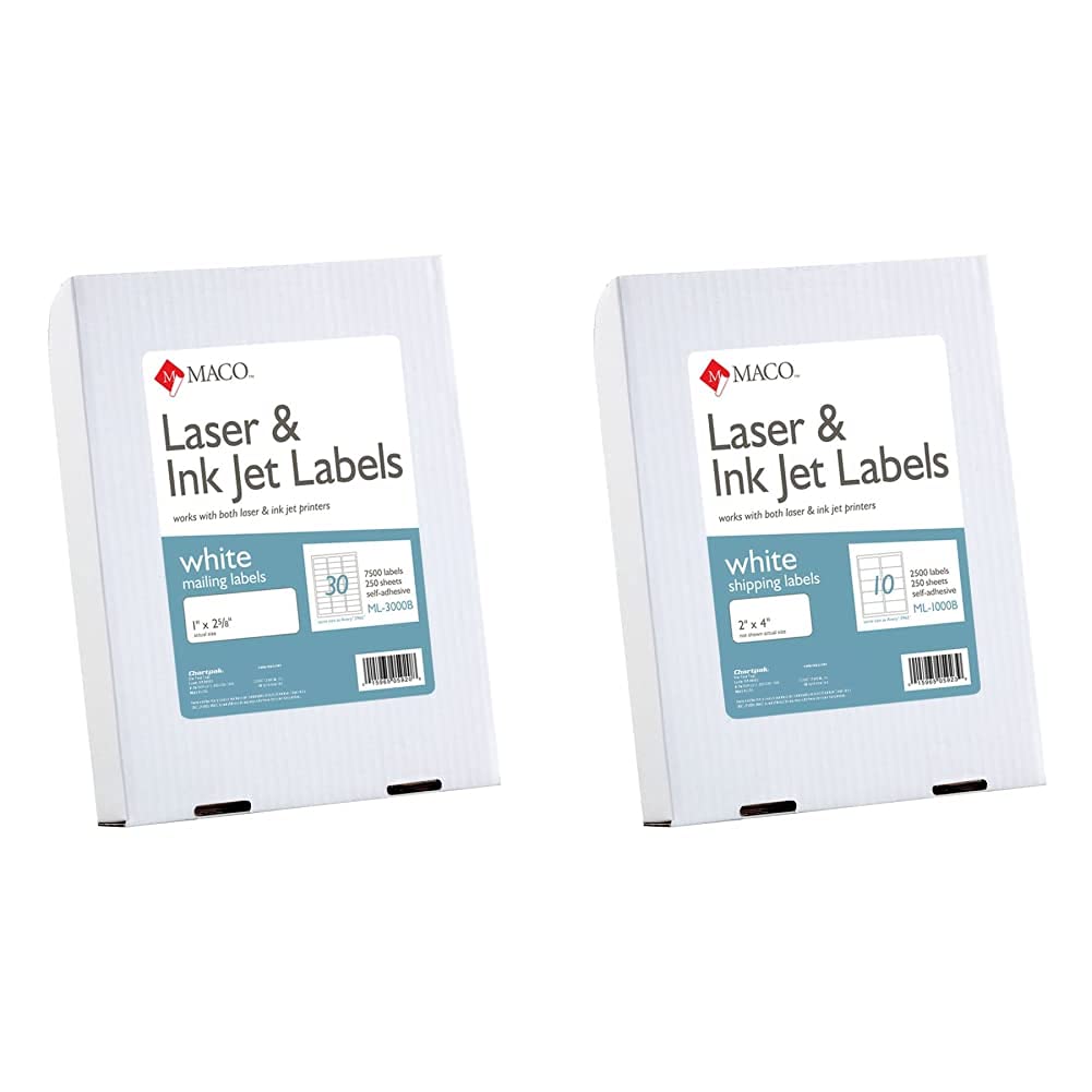 MACO Laser/Ink Jet White Address Labels, 1 x 2-5/8 Inches, 250 Sheets, 7500 Per Box (ML-3000B) & Laser/Ink Jet White Shipping Labels, 2 x 4 Inches, 10 ...
