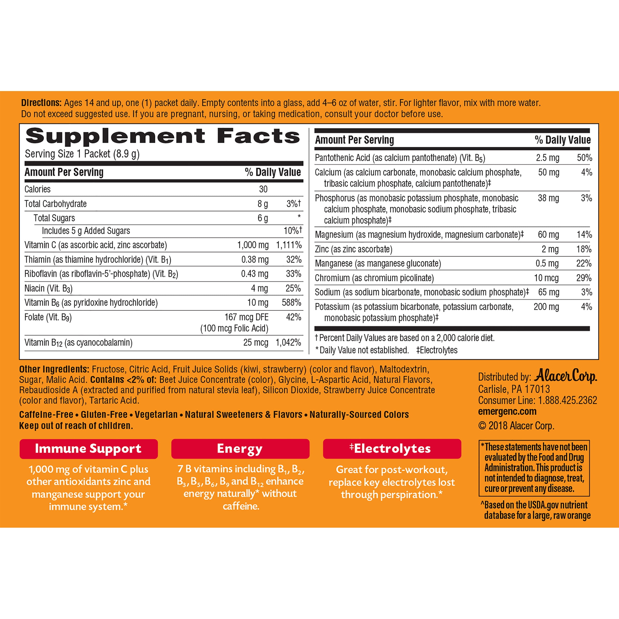 Emergen-c nutrition label. Everything You Should Know About Emergen-C - HealthDigest.com Feb 22, 2022 · According to the official website, Emergen-C's original formula contains 1,000 milligrams of vitamin C, seven B Vitamins, zinc, manganese, and electrolytes.Emergen-C's ingredients page goes into detail about the benefits of these components, naming vitamin C as "essential in maintaining a healthy immune system, and ... critical to the formation of collagen" and zinc as necessary to "maintain ... Enfamil Poly-Vi-Sol Multivitamin Dietary Supplement Drops - 1 ... A: Hello! Thank you for reaching out about getting more information on our Enfamil Poly-Vi-Sol with Iron Liquid Multivitamin Supplement! In 2019, we revised the Enfamil Poly-Vi-Sol with Iron label to comply with new regulations for the Nutrition Facts panel; the formulation was also adjusted to meet 100% of the new Daily Values for infants for all nutrients except vitamin A. B-complex with Vitamin C Dietary Supplement Tablets - Target Read reviews and buy B-complex with Vitamin C Dietary Supplement Tablets - 300ct - up & up™ at Target. Choose from contactless Same Day Delivery, Drive Up and more. Amazon.com: Emergen-C Hydration+ Sports Drink Mix With ... Mar 13, 2017 · Emergen-C Original Formula Emergen-C Immune+ Emergen-C Energy+ Emergen-C Hydration Emergen-C Protein Fuel & Superfoods ; Benefits : Provides daily immune support* with Vitamin C (1), plus other antioxidants (2), B Vitamins and electrolytes (1) Based on the USDA.gov nutrient database value for a large, raw orange (2) Zinc and Manganese