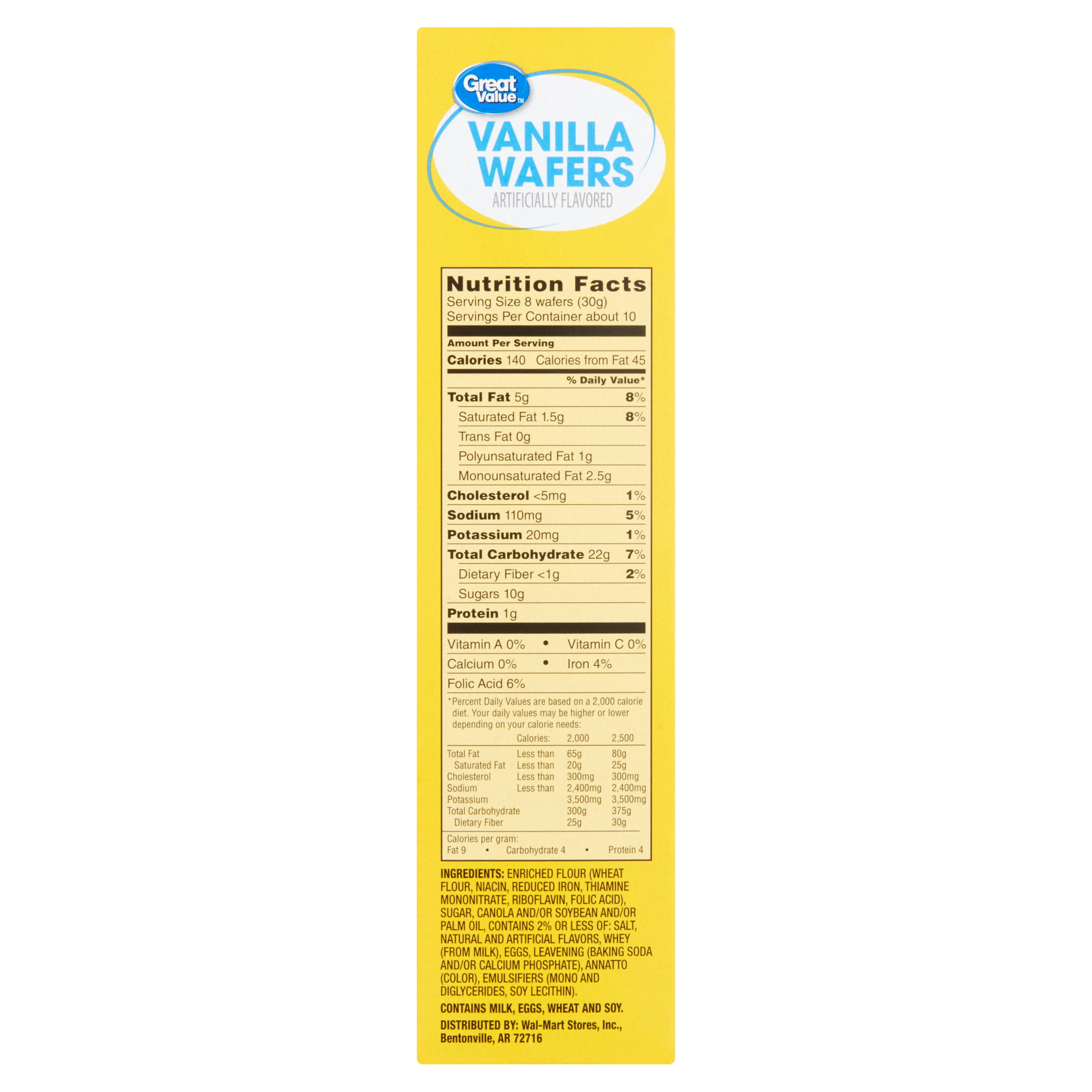 Easy Layered Nilla Wafer Banana Pudding Trifle Set aside. Whisk the milk, eggs, sugar, and flour together in a semi-deep sided saucepan and cook over medium-low heat, whisking constantly, for about 20 minutes. The mixture will start out watery and will end moderately thickened. Cut in the butter and the banana extract, stirring until the butter has melted. Nabisco Nilla Wafers Nilla Mini Wafers 11 oz - SmartLabel™ Nutrition Facts About 10 Servings Per container Serving Size 20 wafers (30g) Amount Per Serving Calories 140 % Daily Value * Total Fat 6 g 9.0% Saturated Fat 1.5 g 7.0% Trans Fat 0 g Cholesterol 5 mg 0.0% Sodium 115 mg 5.0% Total Carbohydrate 21 g 7.0% Dietary Fiber 0 g 0.0% Total Sugars 11 g Protein 1 g Vitamin C 0.0% Calcium 0.0% Iron 6.0% Order Acme - Crav'n Flavor Original Vanilla Wafers Vanilla Wafers, Original. Vanilla Wafers, Original *EBT Eligible. UPC: 00036800475793. Nutrition Facts. Customers Also Bought Similar Products Recipes Used In. SALE! $0.99 $0.70. 6.0 oz. Yoplait Light Yogurt - Very Vanilla Sign in to Add. $1.99. 5.0 oz. StarKist Albacore Tuna, in Water, Chunk White