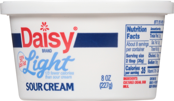 Daisy Pure & Natural Light Sour Cream - 8oz : Target Read reviews and buy Daisy Pure & Natural Light Sour Cream - 8oz at Target. Choose from Same Day Delivery, Drive Up or Order Pickup. Free standard ... that you do not rely solely on the information presented on our Web or Mobile sites and that you review the product's label or contact the manufacturer directly if you have specific product ...
