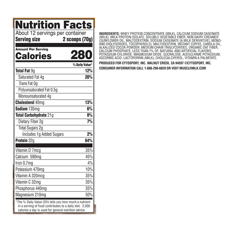 Muscle Milk Nutrition Facts. Calories, carbs, fat, sodium & more ... Muscle Milk Learn more MyFoodDiary Breadsmith Applegate Old El Paso Nature's Own Burger King Ghirardelli Athenos Nabisco Taylor Farms Lindt Reese's Johnsonville Sabra MM's Culver's Breyers Post Mott's Arby's Papa John's SkinnyPop Signature Select IHOP Betty Crocker Oikos Compliments Triscuit Skippy Stouffer's Dannon Don Pablo's Tropicana Milk Ingredients Label : Top Picked from our Experts Milk, fat free (skim) nutrition facts and analysis. Milk, fat free (skim) contains 0.1 g of saturated fat and 7.3 mg of cholesterol per serving. 244 g of Milk, fat free (skim) contains IU vitamin A, 0.0 mg of vitamin C and 2.68 mcg of vitamin D as well as 0.00 mg of iron, 322.08 mg of calcium and 407 mg of potassium. Muscle Milk: 3 Major Side Effects - Healthline Muscle Milk has become a ubiquitous nutritional supplement drink. It's found not only in supplement stores, but also at most corner markets. Its ingredients, according to its website, include... Muscle Milk Pro Series Nutrition Label - This Nutrition Muscle Milk Pro Series Nutrition Label. Author: Mark Velov Last Updated: August 08, 2022. Learn more information about muscle milk pro series nutrition label. In this article we'll discuss muscle milk pro series nutrition label.