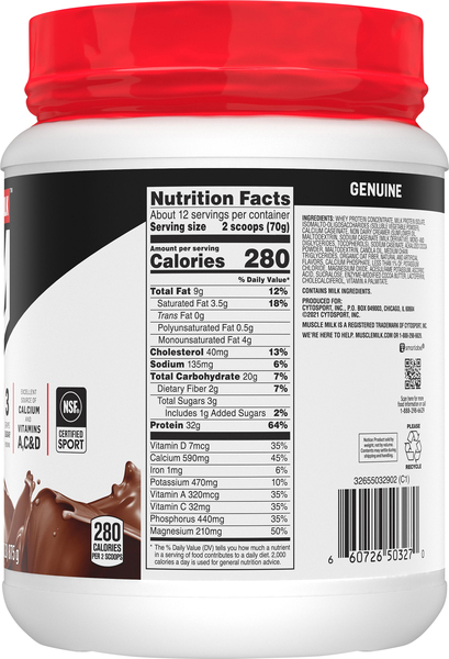 Muscle Milk Genuine Protein Powder, Chocolate, 1.93 Pounds, 12 Servings, 32g Protein, 3g Sugar, Calcium, Vitamins A, C & D, NSF Certified for Sport, ...